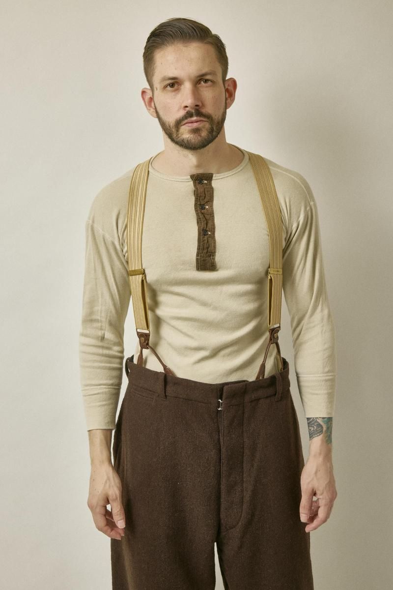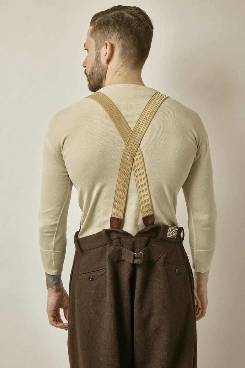 Original suspenders made with a unique elastic mix and backside two point split for attachment with buttons.